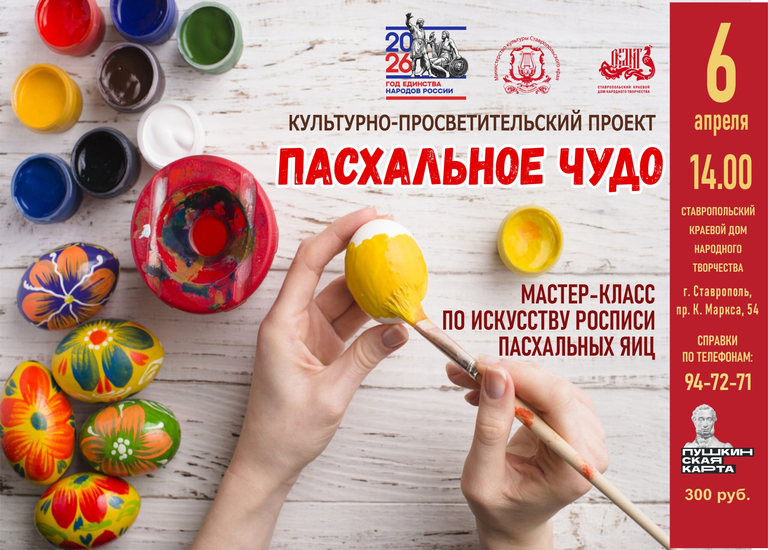 В Ставропольском краевом Доме народного творчества состоится увлекательное занятие, посвящённое искусству росписи пасхальных яиц. В преддверии Светлого праздника Пасхи участникам мероприятия будет предоставлена уникальная возможность прикоснуться к старинным народным традициям.